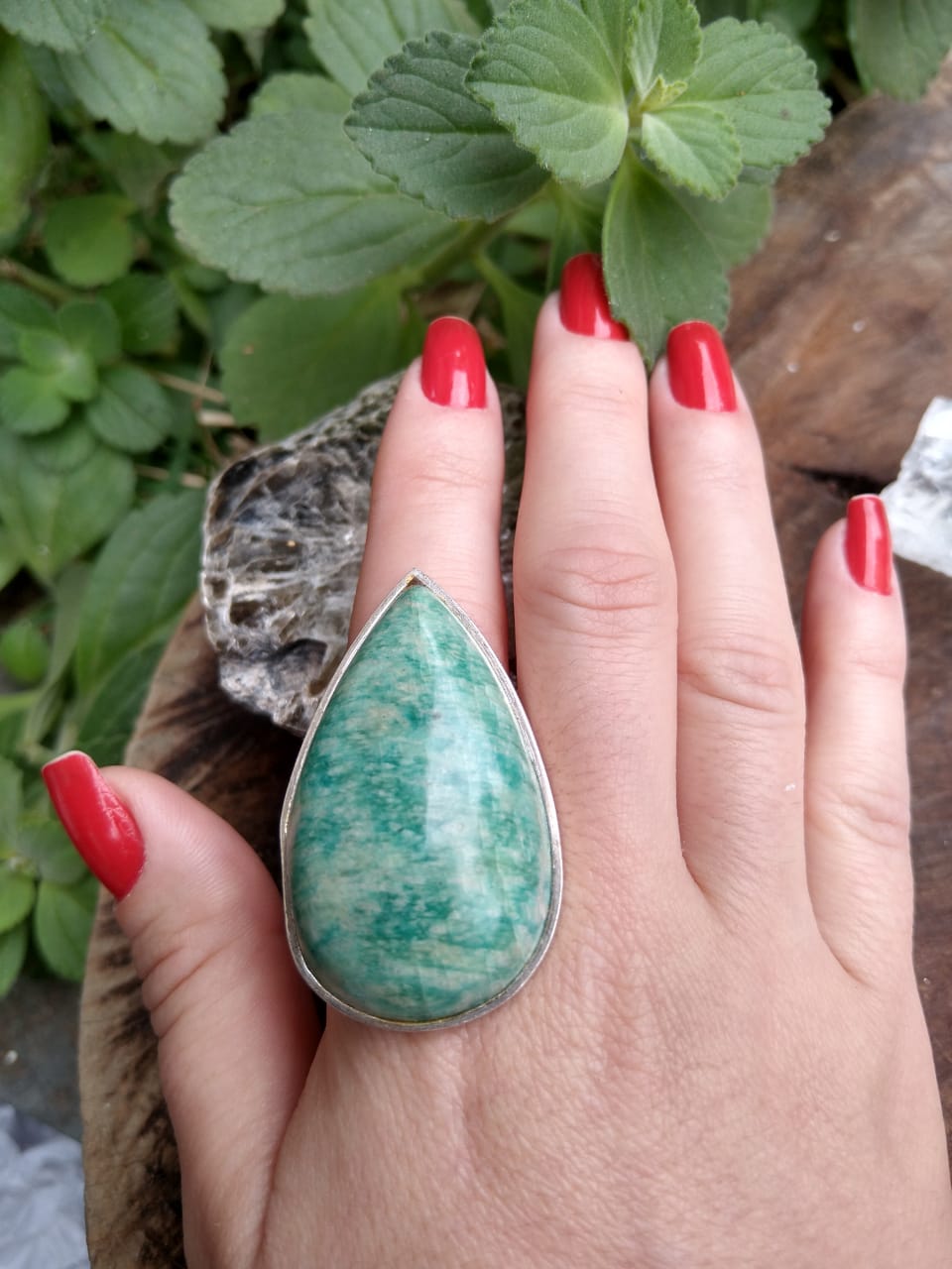 Anel gota Amazonita 45×35 fabricado a mão em prata 950 ,23 g peso total sendo aprox. 10 g de prata e 65 quilates aprox. de pedra natural de amazonita.