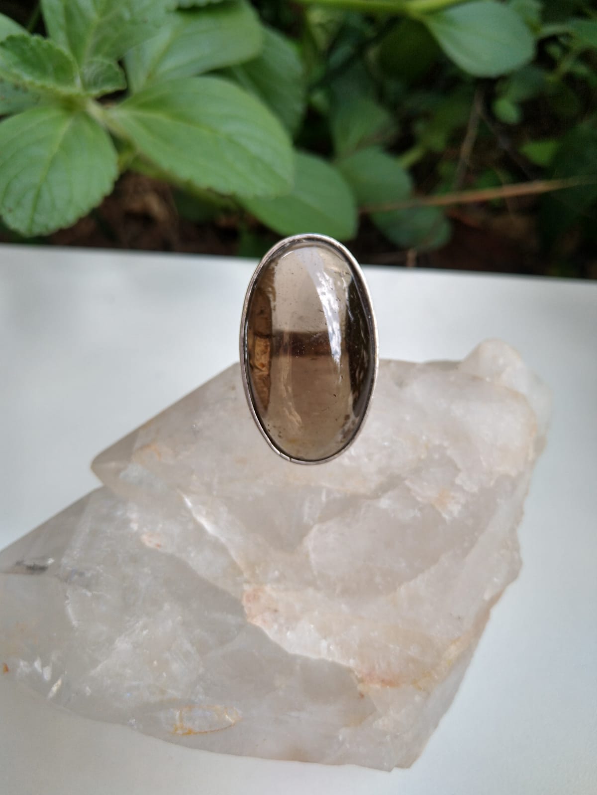 Anel de Quartzo fumê natural fabricado a mão em prata 950.