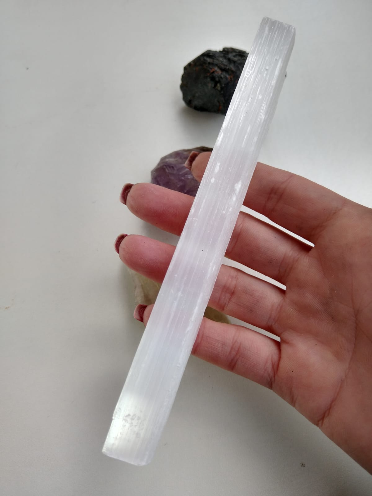 Selenita: Promove a limpeza energética de outras pedras, pessoas e do ambiente onde você está fazendo seus atendimentos.